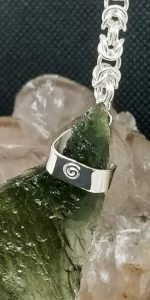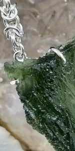 Stunning 14.0 gram, A-grade moldavite from Chlum, Czech Republic with a handmade byzantine chain. Set in handcrafted sterling silver mounting.
