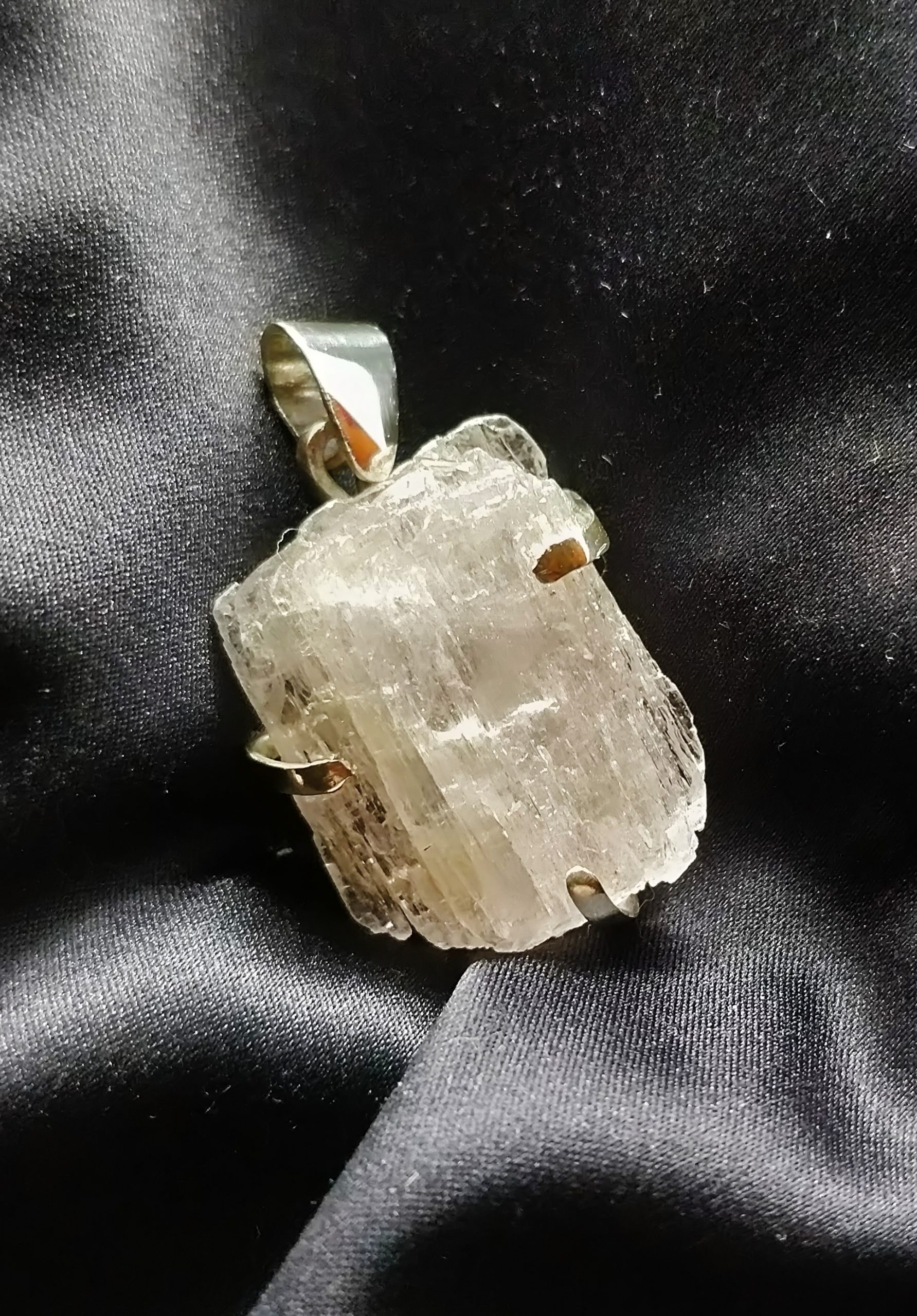 Raw, natural, pinkish kunzite. Set in handcrafted sterling silver mounting.