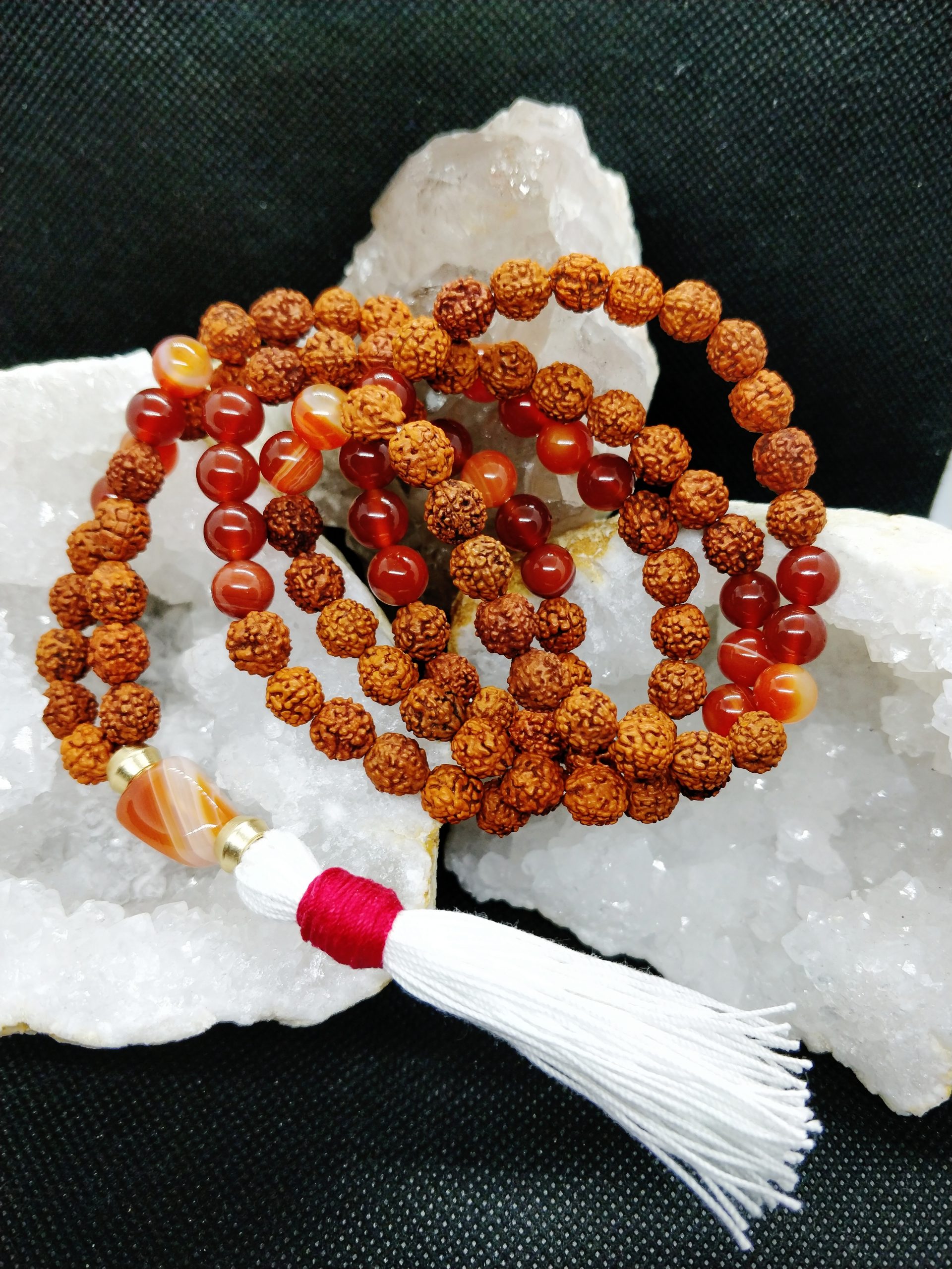 Mala beads with rudraksha seed, carnelian/ orange agate (8mm), guru bead: orange agate, tassel handmade cotton. 108 beads +guru bead, length 86cm.