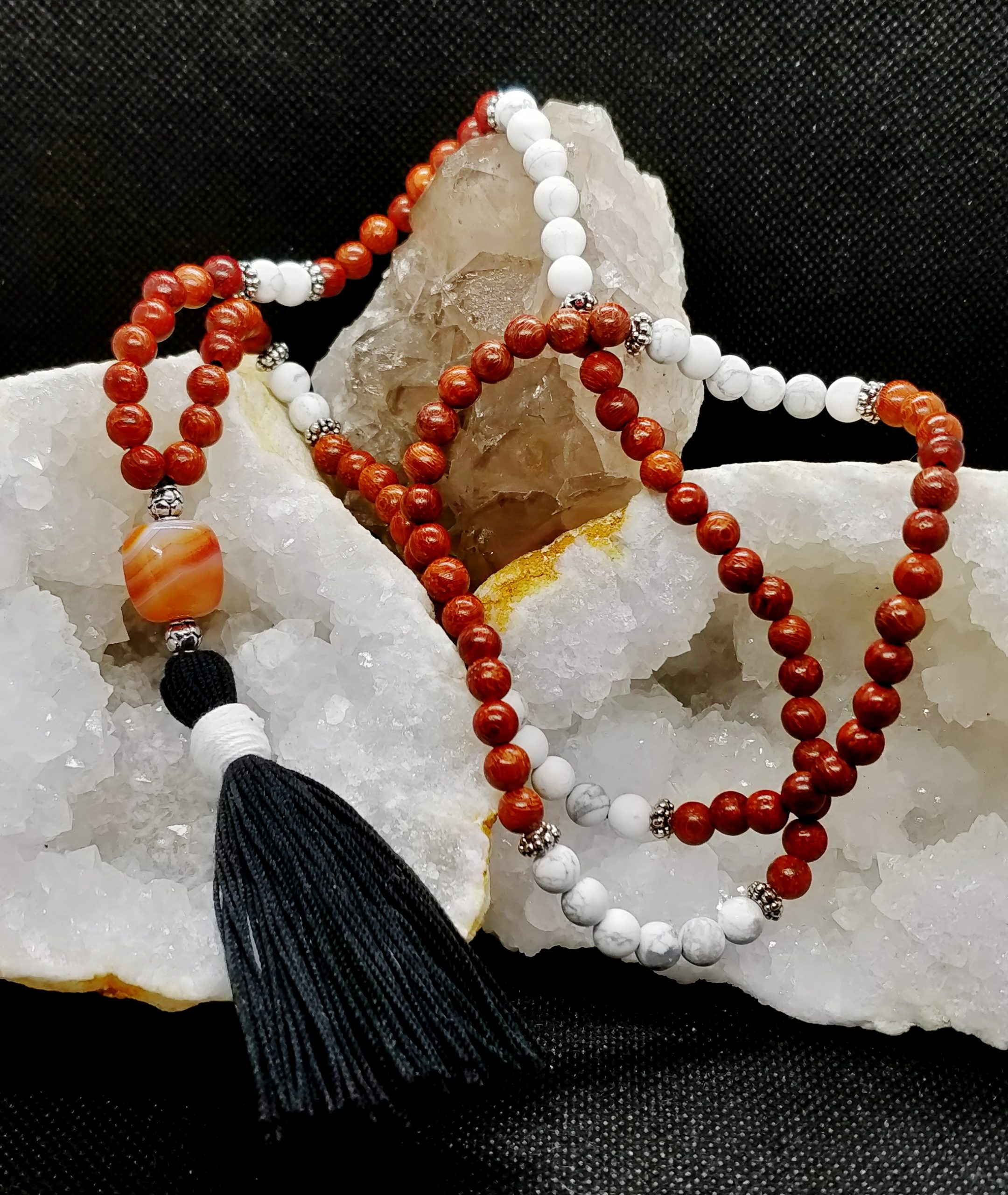 Mala beads with redbrown rosewood and howlite (6mm), guru bead orange agate, tassel handmade cotton. 108 beads + guru bead, length 70cm.