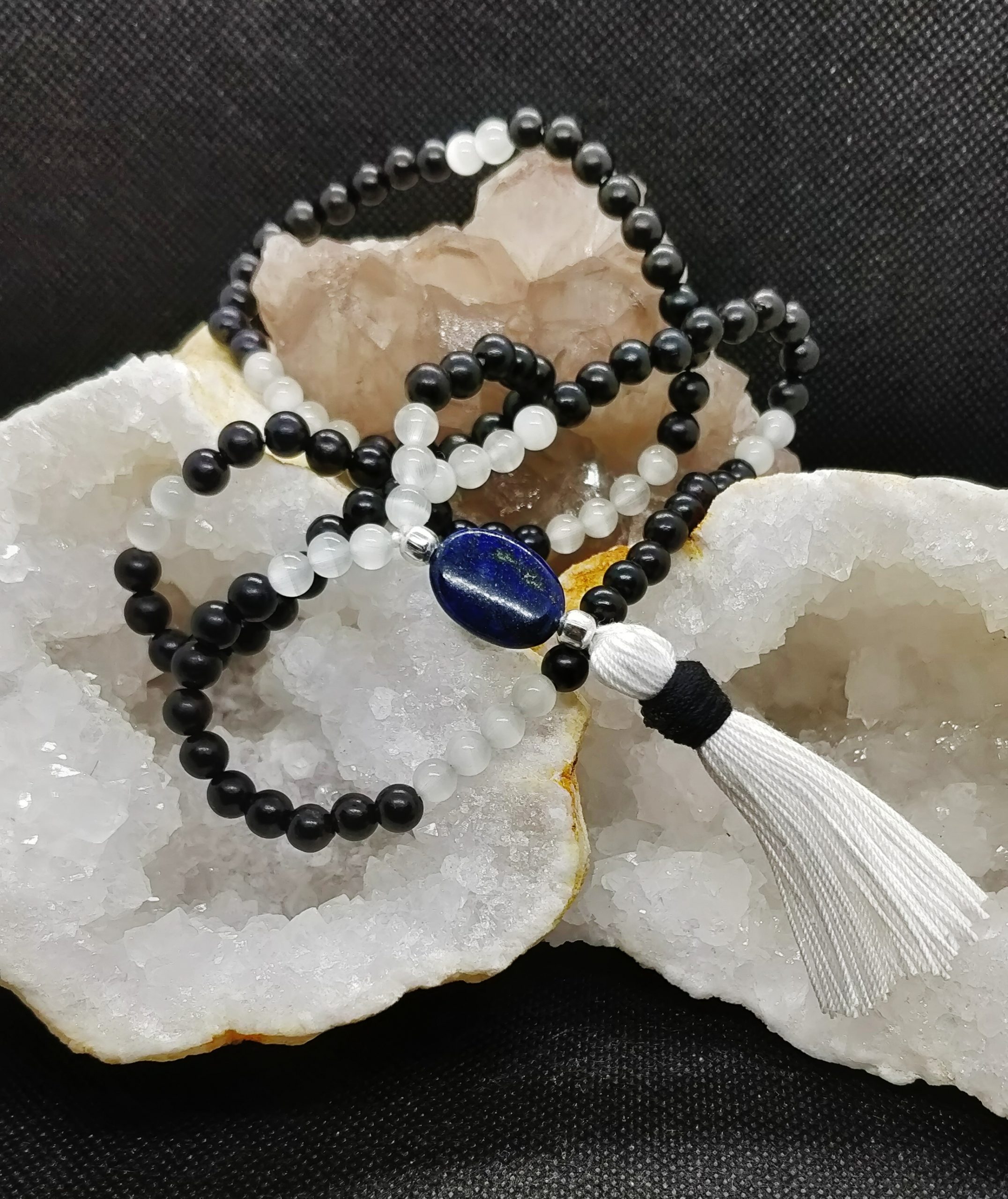 Mala beads with selenite and ebony black sandalwood (6mm), guru bead lapis lazuli. 108beads + guru bead, length 64cm.