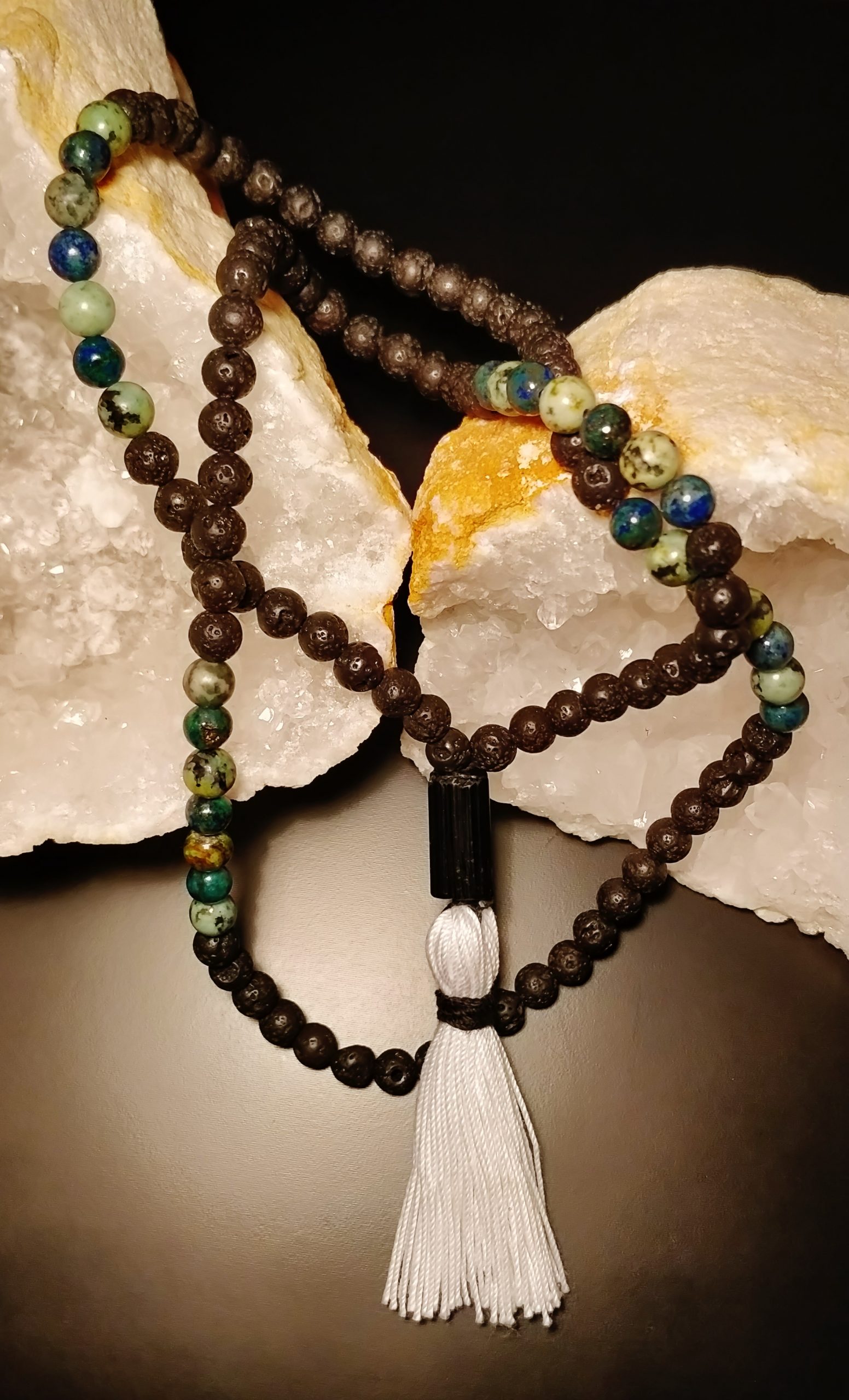 Mala beads with African turquoise, azurite chrysocolla and lavastone (6mm), guru bead raw black tourmaline, tassel handmade cotton. 108 beads + guru bead, length 68cm.