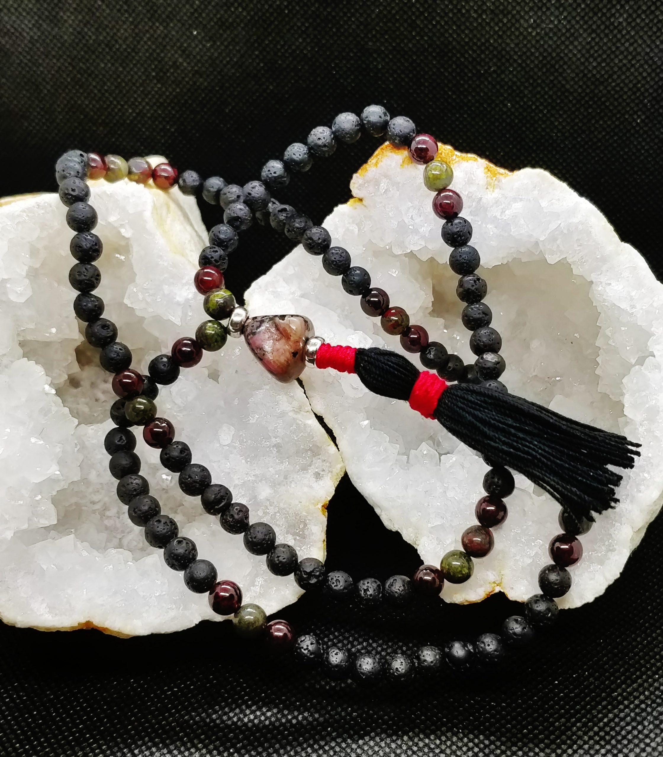 Mala beads with dragon bloodstone, red garnet and lavastone (6mm) with a rhodonite guru bead, tassel handmade cotton. 108 beads + guru bead, length 69 cm.